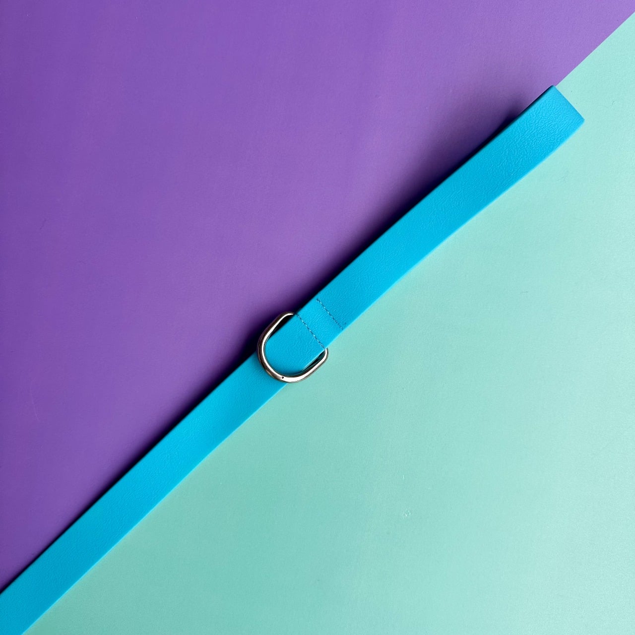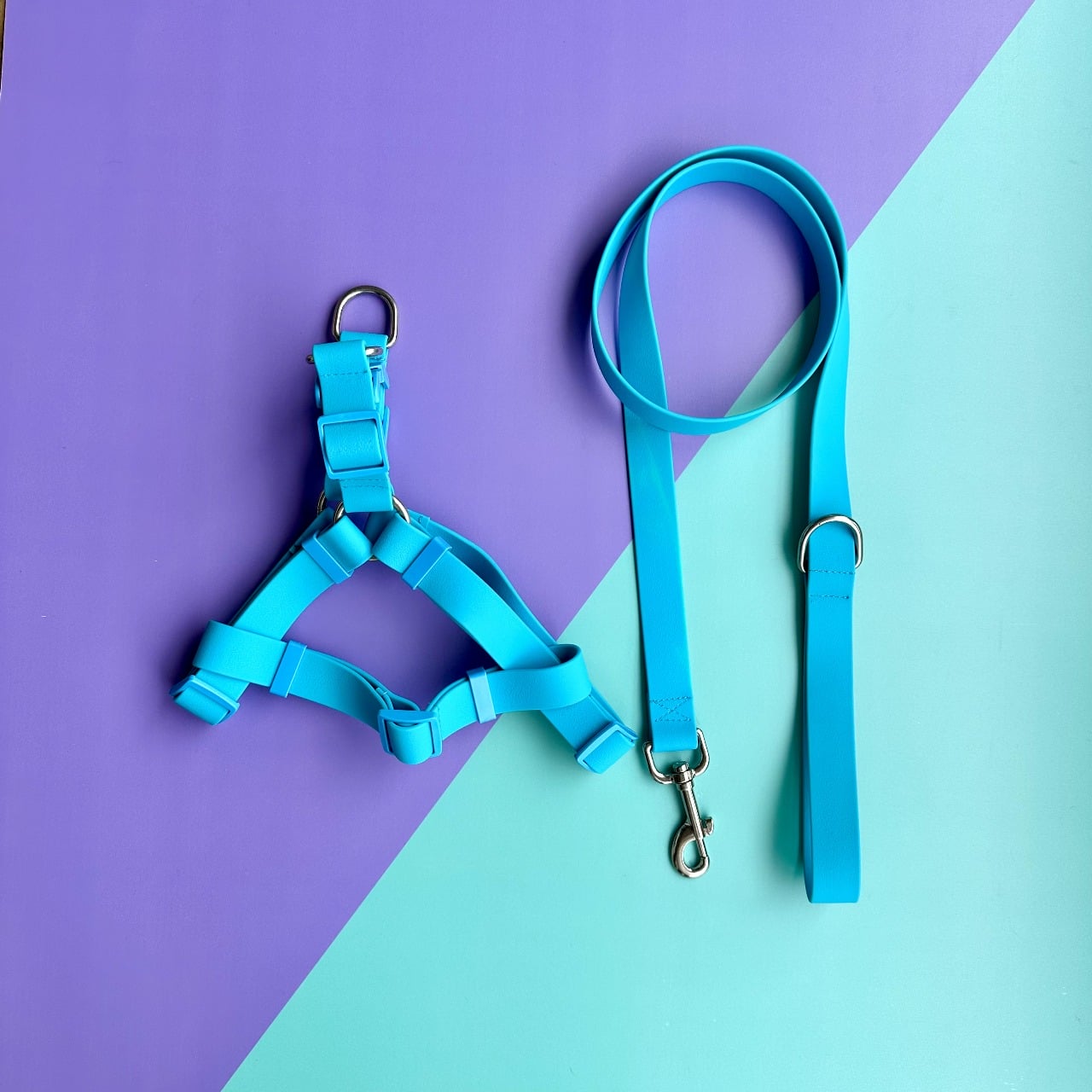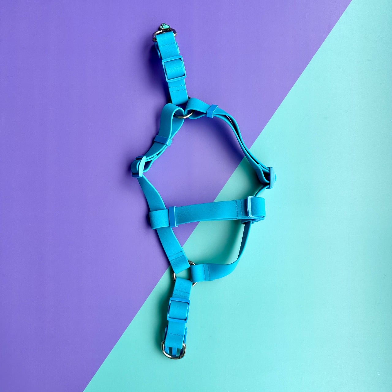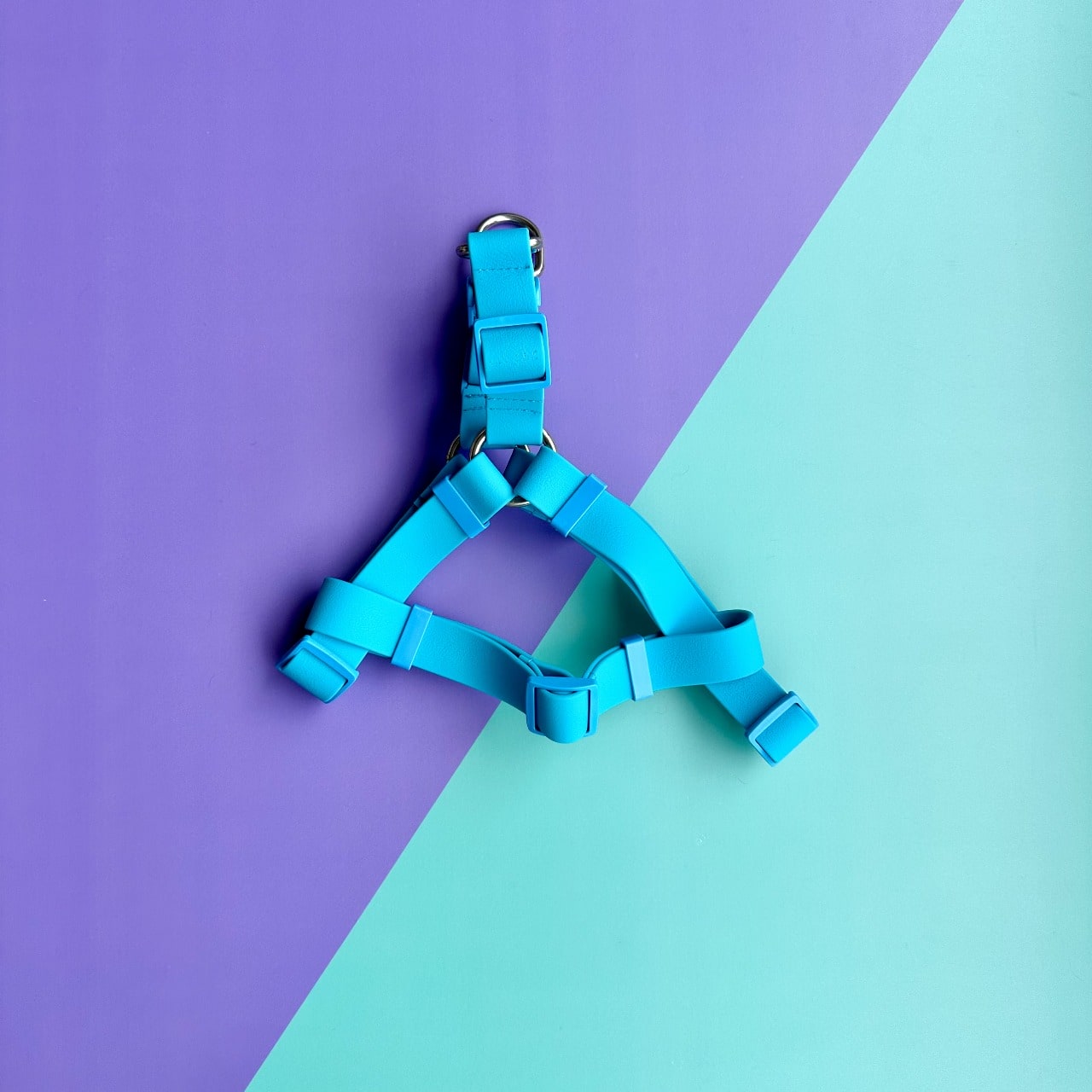 Arnés para perros en goma impermeable azul, resistente e hipoalergénico.