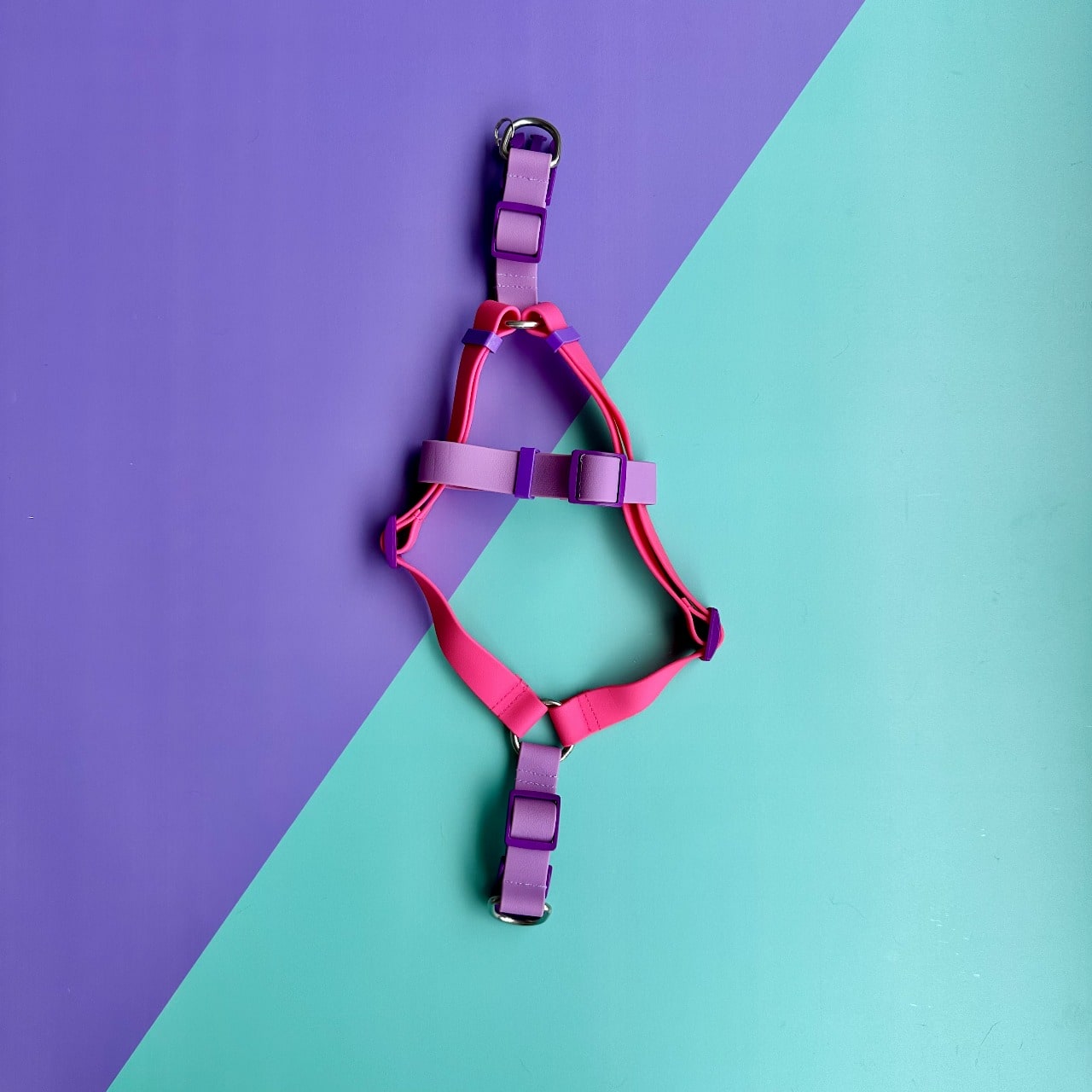 Arnés para perros en goma impermeable, fucsia y lila, resistente e hipoalergénico.