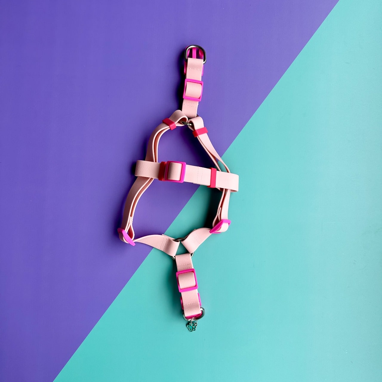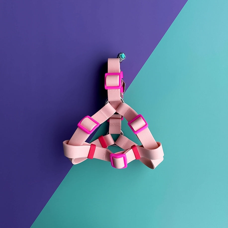 Arnés para perros en goma impermeable, rosado, resistente e hipoalergénico.