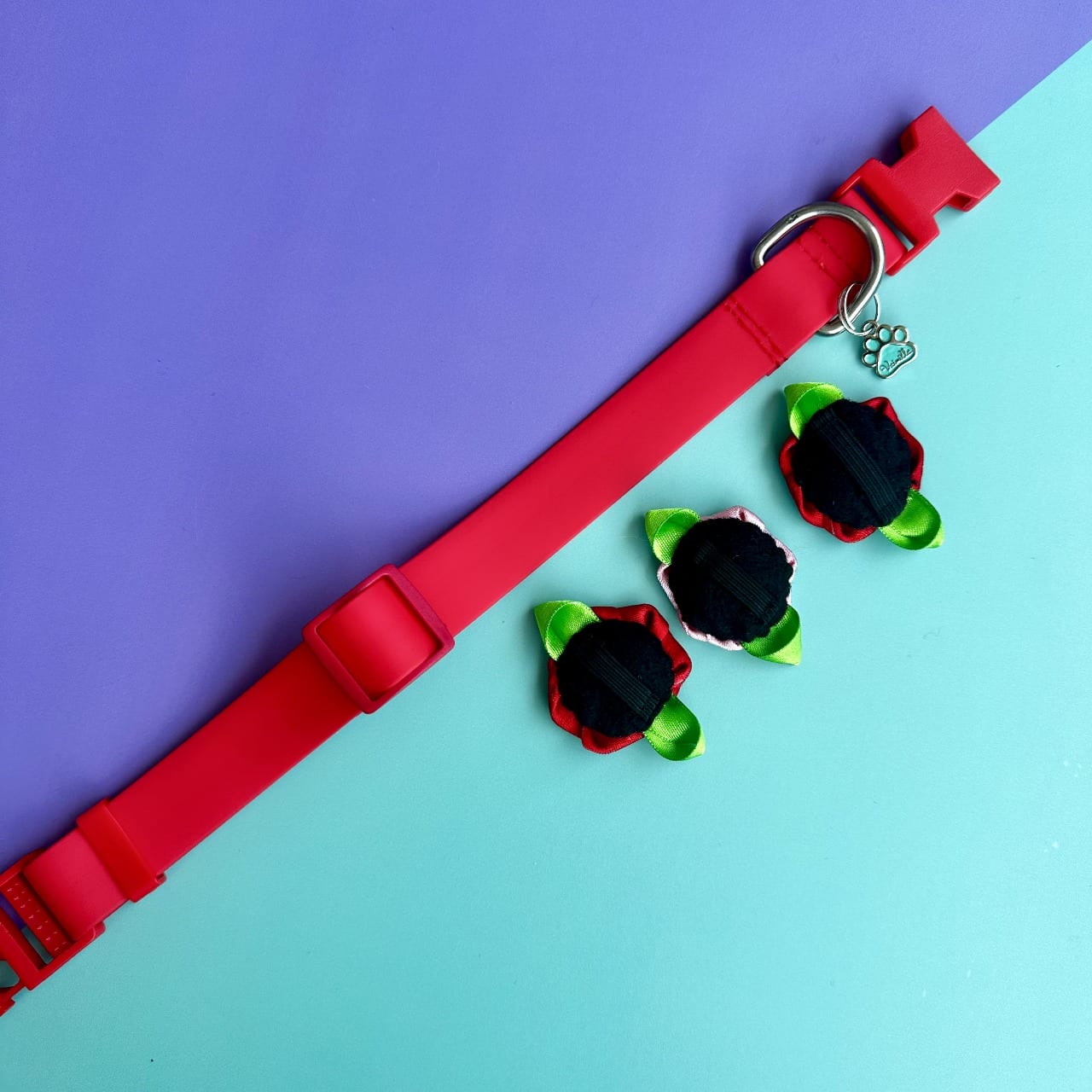Collar para perros en goma impermeable rojo y rosado con rosas