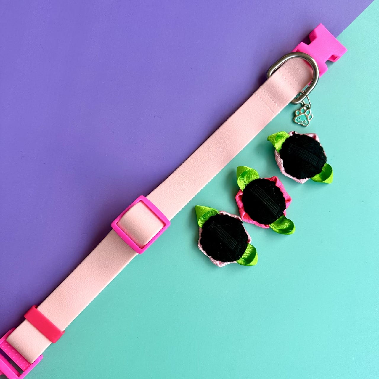 Collar para perros en goma impermeable rosado y fucsia con rosas