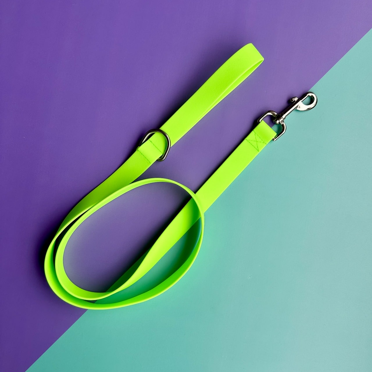 Correa para perro en goma impermeable, en color verde neón, elaborada en reata forrada en PVC tipo goma, un material flexible, hipoalergénico y de alta resistencia.